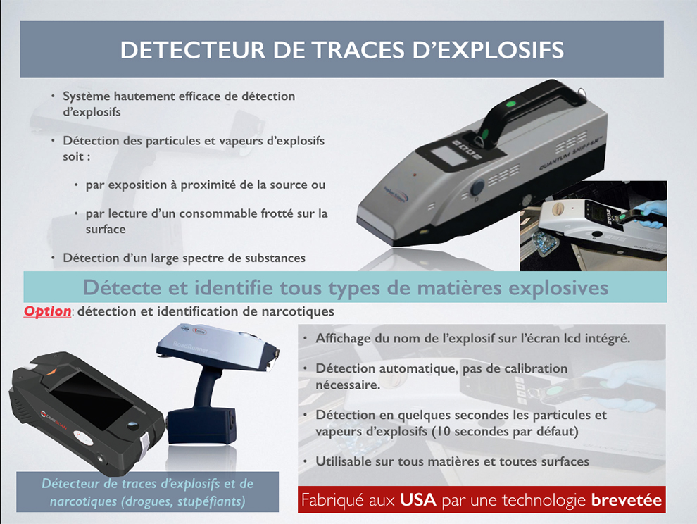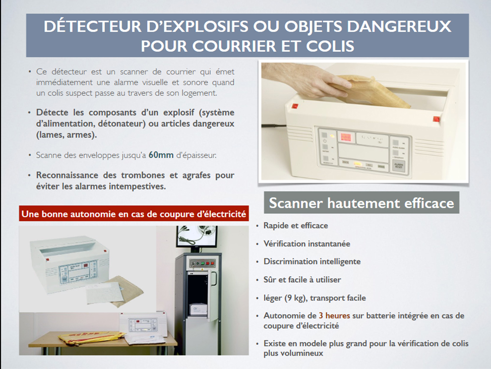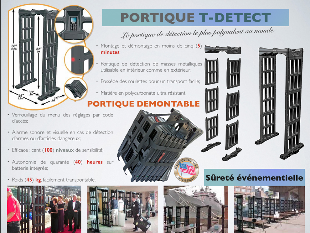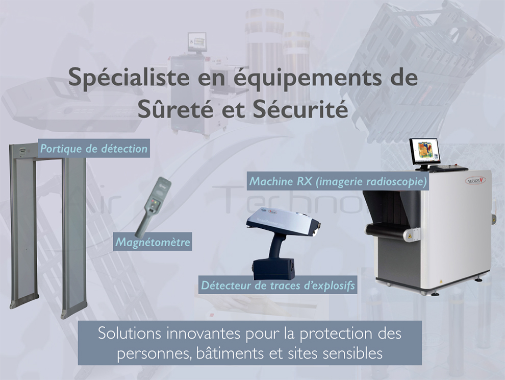 Nous fournissons des solutions complètes d’inspection et de filtrage tels des portiques de détection de masses métalliques, des machines d’imagerie-radioscopie à Rayons-X et des détecteurs portatifs ou manuels. Nous proposons des équipements très innovants et très polyvalents tels des portiques démontables (montage et démontage en moins de cinq (5) minutes) pour une utilisation en extérieur ou pour la sécurité évènementielle et des analyseurs de courrier et de colis pour la détection d’éléments d’explosifs.